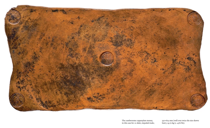 In 1656, Johan Palmstruch was finally granted the country’s first bank charter by the King of Sweden after multiple rejections. (His proposal only succeeded after he promised half the profits to the Crown.) At the time, people had to use cumbersome copper and silver currency (see above) that fluctuated in value based on industrial demand for those metals. The slab of copper above was “10 dalers” and the size of two sheets of letter paper and weighed 43 pounds!