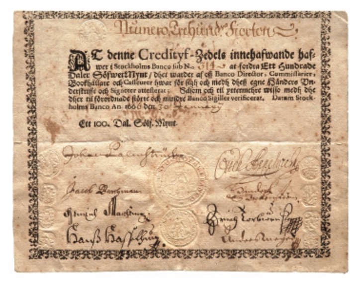 A simple piece of paper could now represent any amount of dalers (100 daler note below):