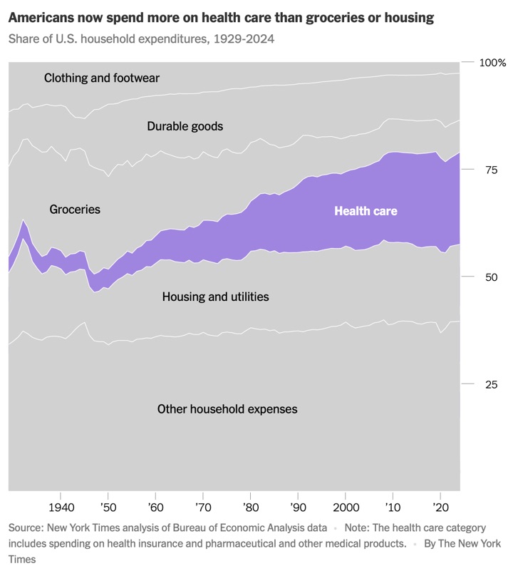 The NYTimes article How Health Care Remade the U.S. Economy (gift) shows us how this came to be over time. Healthcare costs include insurance premiums as well as drugs and other medical products.