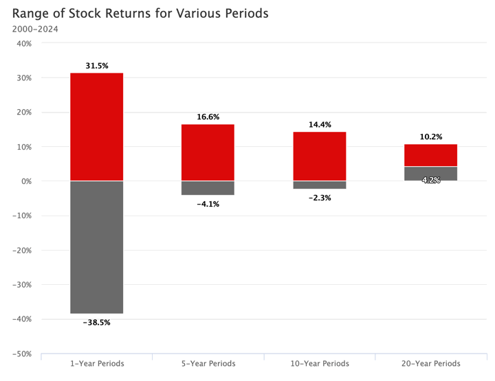 2. Here is the range of S&P 500 stock returns for various holding period lengths from 2020-2024.