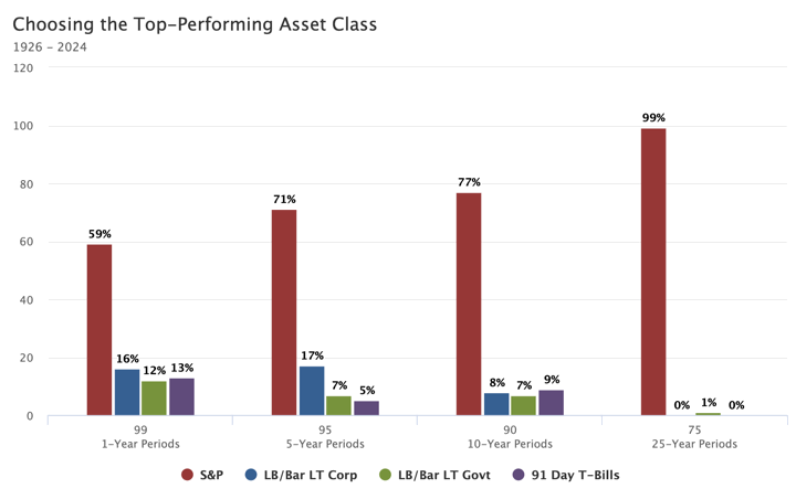 3. Here is a bar chart of the top performing asset classes for various holding period lengths from 1926-2024.