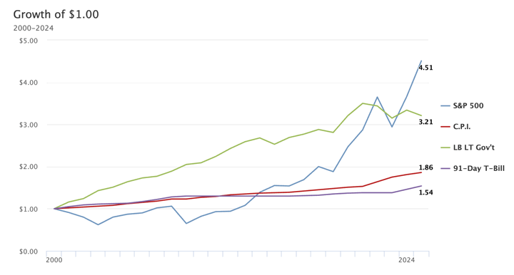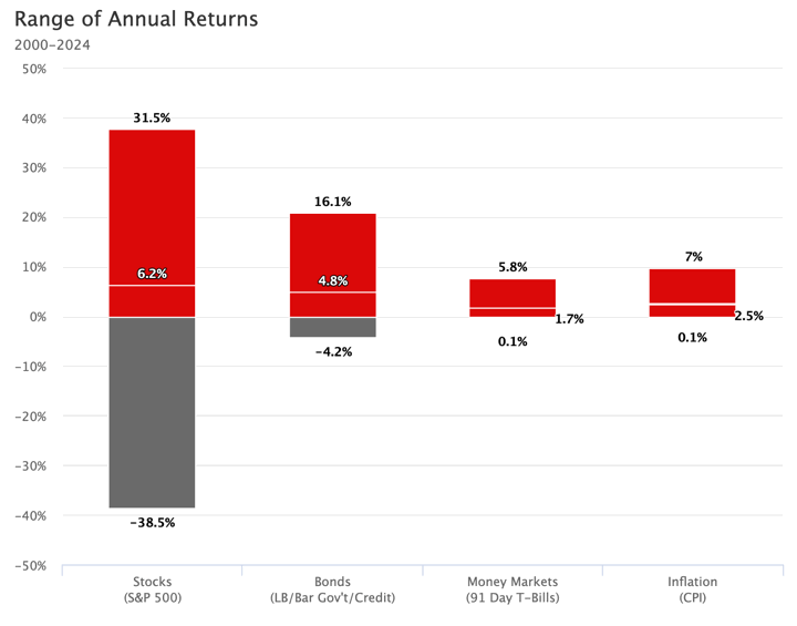 4. Here is the range of annual returns for the major asset classes from 2000-2024.