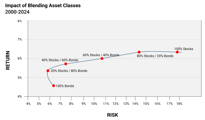 6. Here is the impact of blending different percentages of stocks and bonds on their combined performance and volatility.