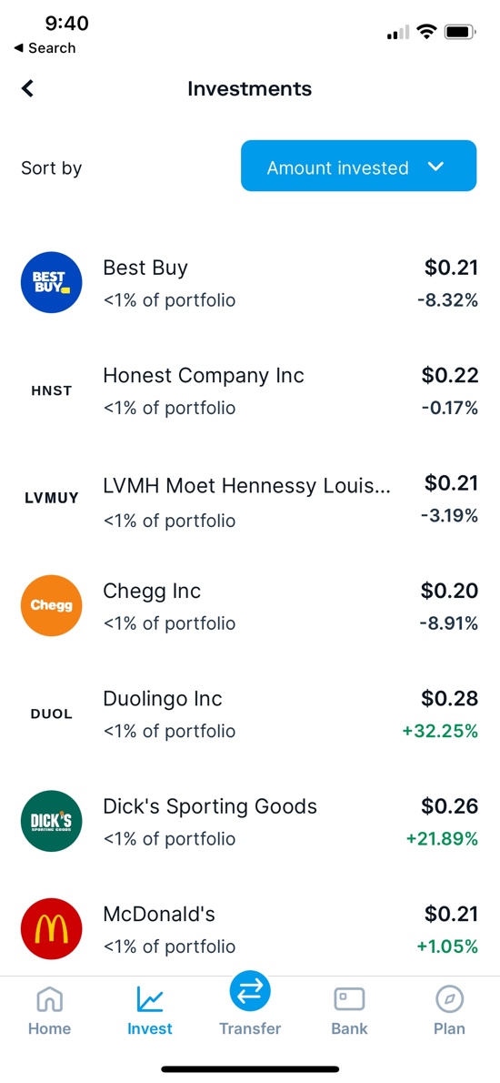 The main draw to this app is the ability to automatically build a portfolio using small, regular amounts. This feels like a descendent of dividend reinvestment plans (DRIPs) where you would send in a check for $25 or $100 and be invested in a company’s stock like ExxonMobil. My great-aunt still gets a check every quarter from ExxonMobil from a DRIP she started decades ago. These days, you can pick nearly any company or group of companies via index ETFs.