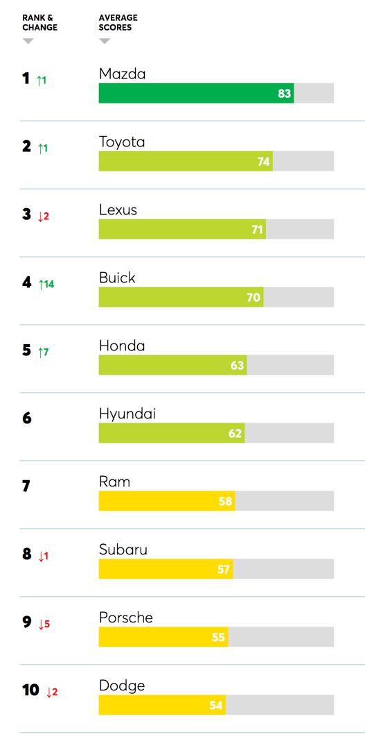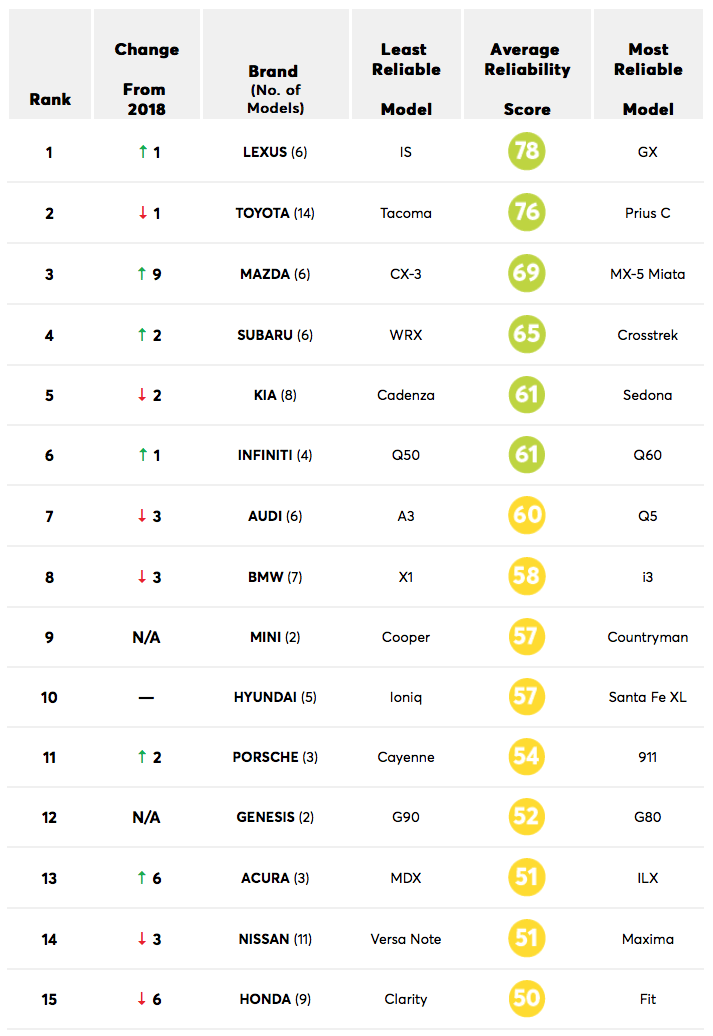 Consumer Reports has released their annual “Best Cars” issue. Their definition of “best” involves a combination of their self-conducted road tests, safety ratings, owner satisfaction surveys, and owner reliability surveys. However, I’m mostly just concerned about their reliability ratings. I like to track the ones moving up and the ones moving down. I do believe it says something broad about the current state of each manufacturer.