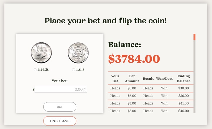 For example, one simple way that you can lose money even with the odds in your favor is poor bet sizing. The authors created the Elm Wealth Coin Flip Challenge in order to teach this interactively. In the game, the coin is altered such that you know it will come up heads 60% of the time, and tails 40% of the time. If you know anything about gambling in the real world, you’ll know this is a huge advantage! Dramatic movies about card counting and the MIT Blackjack team involves edges of only ~1%.
