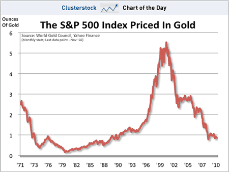 I don’t know what if anything this chart tells me, but for some reason I was compelled to post it here for posterity. Below is the S&P 500 index priced in terms of ounces of gold, from 1971-2010. Via BusinessInsider.