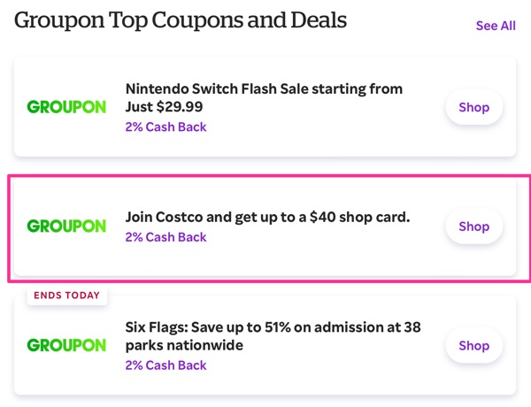Save even more on your Groupon with a cashback shopping portal. For example, trigger the Rakuten new member bonus ($50 bonus right now after you spend $50) and also get 4% back. If Groupon doesn’t give it to you, send them this screenshot from their own website after searching for “Costco” and scrolling down (taken 10/30/25):