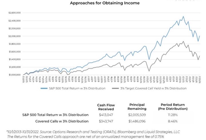 The chart below from the article compares the performance results between simply withdrawing 3% a year from your S&P 500 portfolio from 2013 to 2022, as opposed to writing covered calls with a 3% yield on your S&P 500 portfolio. The chart does add a 0.75% annual management fee for this approach, but even if you add that back in, the difference is still 11.3% vs. 9.2% annualized return.