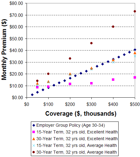If you are youngish and in good health, even a long 30-year term policy is comparable to the group rates. Even if you are in average health, the cost of my employer group insurance is comparable to the premium on a 15-year term policy.