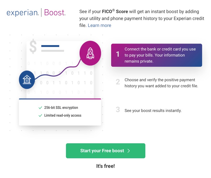 Bottom line. Experian Boost is a free way to potentially improve your Experian-based credit score by adding on-time utility and phone bill payments. I tested it out and it was indeed free with no credit card required nor trials to cancel, although you will have to share your bank transaction data. Although free to all, this service will be more helpful for those with a few dings and blemishes on their credit report.