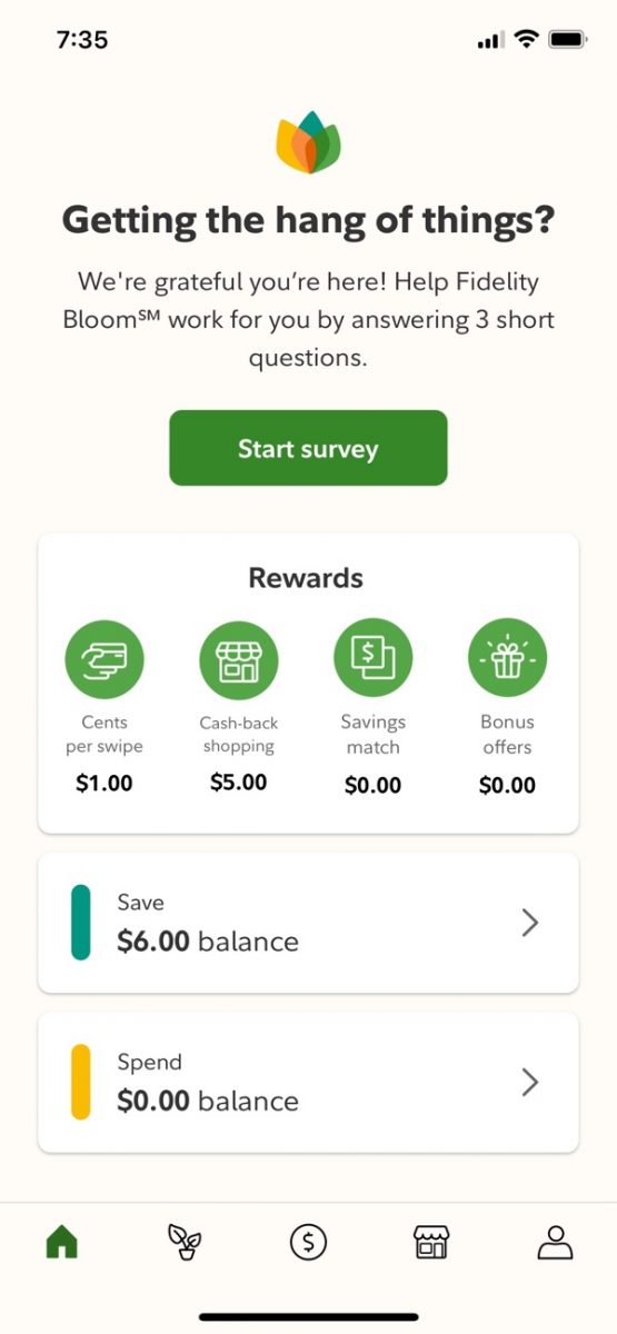 • Hope that was just a temporary glitch! As an existing Fidelity customer, I was able to sign up for Bloom just now and see all of my existing accounts plus the new Bloom Save account, where I initiated a $300 transfer to get in on the rewards. I did experience other buggy behaviors, like getting stuck with no obvious way to complete the Plaid authentication with my bank (so I had to quit out of the process to restart the funds transfer), and I also didn’t like that Bloom still suggested that my new account was empty even though on the same screen it also said I had $300 in incoming funds pending. (The messaging was technically true, but I feel like that is confusing and not confidence-inspiring, especially if this app is designed with less financially-savvy people in mind.) The separate Bloom Spend and Bloom Save accounts was also a little unintuitive, especially if your goal is to get the various rewards, and you’re not paying attention to make sure the funds are going to your Save account. Anyway, just a few quirky things I had to report back.