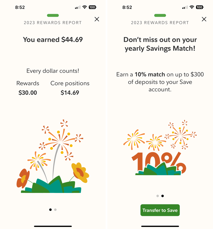 Update January 2024: If you have the Fidelity Bloom app, this is a reminder that the 10% annual savings match is reset and you can again get $30 for a $300 transfer into your Fidelity Bloom Save account. If you use the SPAXX option for cash sweep, you are also earning close to the equivalent of 5% APY (as of 1/3/24). Here is a screenshot of my 2023 rewards: