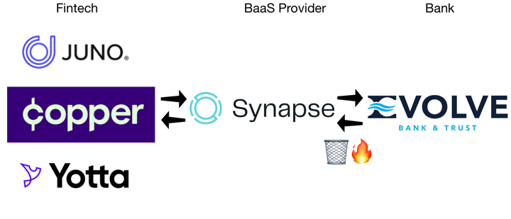 - On May 11th, 2024, Synapse blocked Evolve from accessing to their “Dashboard” which had the transaction ledger data of every fintech user from Juno, Yotta, and Copper. Since this meant that Evolve Bank & Trust couldn’t verify the reason for money coming in and out of the FBO accounts held at their bank, they completely froze access to those FBO accounts.1 This meant that ACH transfers in and out no longer worked, and debit card transactions also failed.