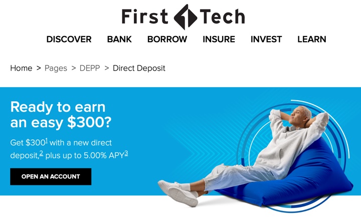 Updated with new bonus details. First Tech Federal Credit Union has a new $300 checking bonus. This new promo is set to run through 6/30/24, but is specifically for their new Reward Checking account that pays up to 5.00% APY (on up to $15,000 balance) if you meet a bunch of different hoops including 20 debit card transactions with $500+ in monthly spend. However, you can still get the $300 without meeting the 5.00% APY requirements. This promo is also valid for existing First Tech Rewards checking account owners who have not set up a direct deposit yet.