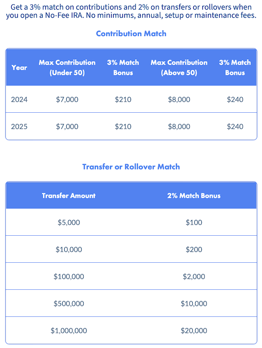 Firstrade is a discount brokerage firm that is smaller but has been around for decades. They have a new IRA match promotion with a 3% match on contributions and a 2% match on IRA transfers and 401k-to-IRA rollovers (up to a $20,000 match amount). They have no minimum balance requirements, no annual fees on the IRA, and they don’t require any premium subscription (like Robinhood Gold). There is a minimum 5-year hold period. You can also get up to $250 in transfer fee rebates for eligible transfers over $2,500. Must open IRA by 2/21/25.