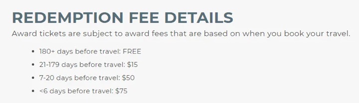 You also avoid the award redemption fee with this credit card. Otherwise, they charge an award redemption fee of between $15 and $75 for all award tickets departing within 180 days of booking.