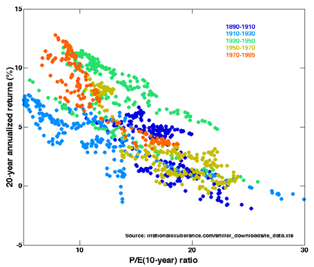 Professor Robert Shiller of Yale University, which provided the above data as well, spoke about the usefulness of this ratio in his book Irrational Exuberance, and provided the data for the following chart. The x-axis shows the real “P/E 10” of the S&P Composite Stock Price Index (inflation adjusted price divided by the prior 10-year mean of inflation-adjusted earnings). The y-axis shows the geometric average real annual return of the same index, reinvesting dividends, and selling 20 years later.