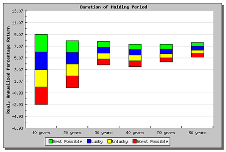For a 20-year forecast, it shows an average outlook of 4% returns, on a real (after-inflation) basis. Of course, the range indicates that the actual returns could look much worse. As the time-horizon lengthens, the range gets smaller due to the phenomenon of reversion to the mean. Kind of scary to look 60 years ahead!