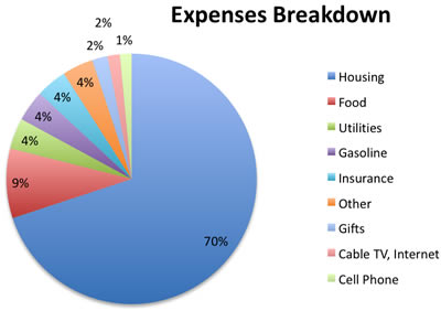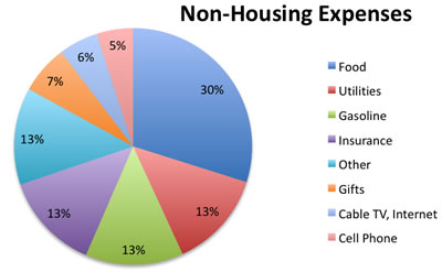 Utilities: $200/month includes electric, gas, sewer, and water. Gasoline: $200/month. Cable TV + Internet: $80/month. Cell Phones: $75/month for two lines.