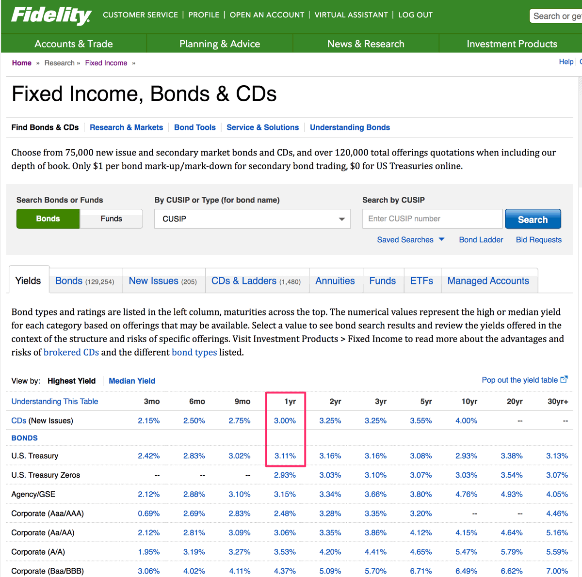 Here is quick walkthrough from buying a (roughly) 1-year Treasury bond on the secondary market via my Fidelity brokerage account. Please note that I am not a professional bond trader nor a tax professional, and I won’t be able to cover every detail. I maintain part of my portfolio bond allocation in roughly a 5-year bond/CD ladder, comparing and buying the top rate amongst US Treasuries, bank CDs, and credit union certificates across the country as they are all fully-backed by the US government. This guarantees that every year, at least 20% of it is liquid and available in adverse conditions like job loss.