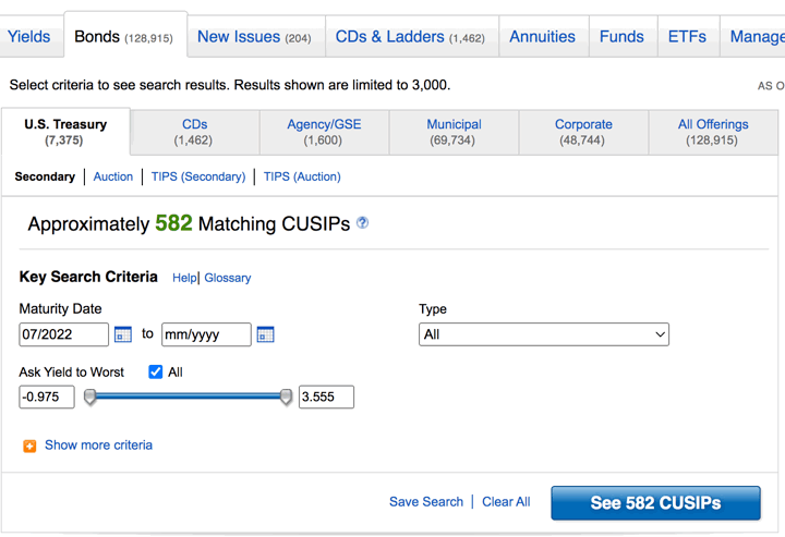 Next, click on the “Bonds” tab > US Treasury bonds > Secondary market. This narrows it down to about 578 bond CUSIPs. This search and trade was completed 7/15/2022.