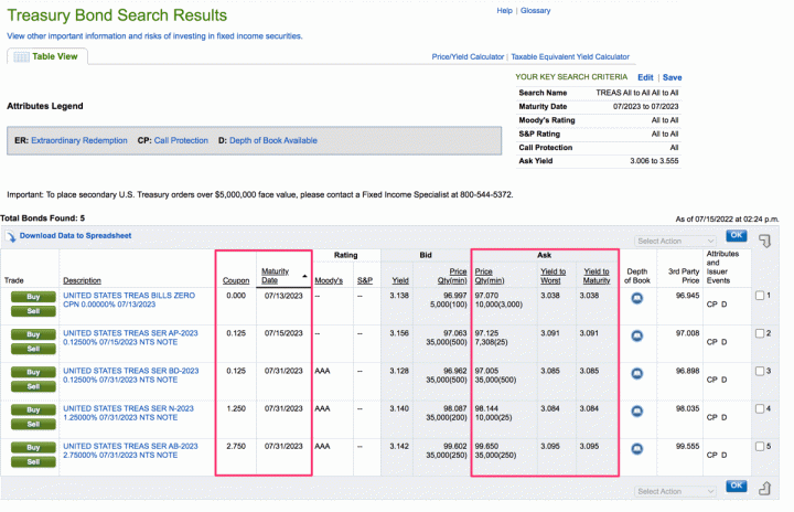 Since I want a Treasury bond with only one year left until maturity, I set the filter for a maturity date between July 2023 and July 2023. That should narrow it down to only 5 bond CUSIPS. Let’s take a look at them (click to enlarge):