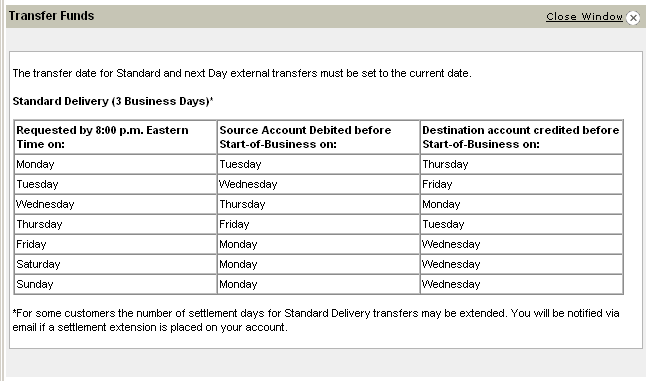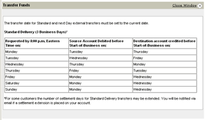 I must admit, after opening up my HSBC Direct account I went ahead and linked all of my numerous other bank accounts (except ING). Other than racking up over $6 in trial deposits, I envisioned having HSBC be my hub for all my interbank transfers. But then I heard some rumblings about how HSBC Direct is really slow with their online bank-to-bank transfers. During the last week, I’ve been shooting various amounts of money around my different accounts, and they have all been following the schedule that HSBC openly discloses. I couldn’t get a link to it as it only works when I sign in, but here is a screenshot of it (click to enlarge):