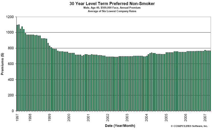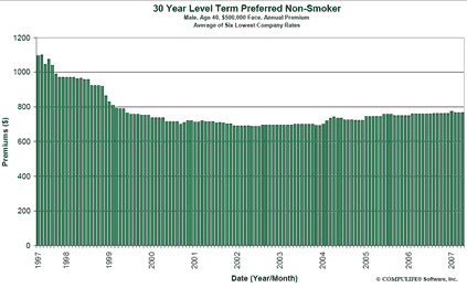 Finally, the current cost of term life insurance is still historically low, so there is not much incentive to wait for better overall rates. Here is the general trend over the last 10 years for 30-year term (click to enlarge):