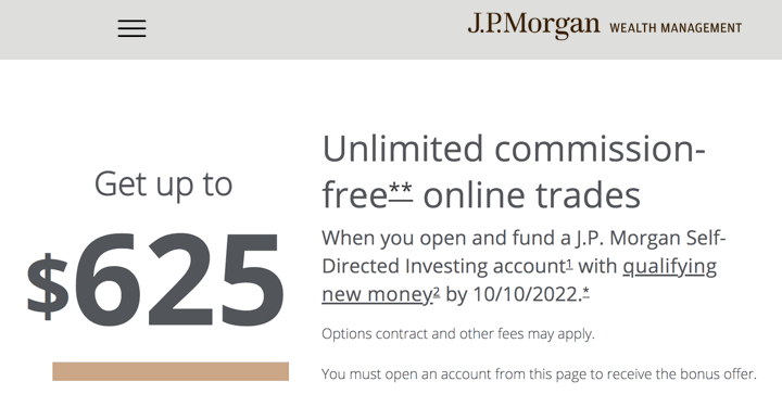Chase started a self-directed brokerage arm called “Chase You Invest”, but I guess that didn’t sound fancy enough, because now it is called JP Morgan Self-Directed Investing (a part of JP Morgan Wealth Management). They are currently offering up to $625 for new accounts, depending the value of assets that you move over (deposit cash or move over stocks and securities):
