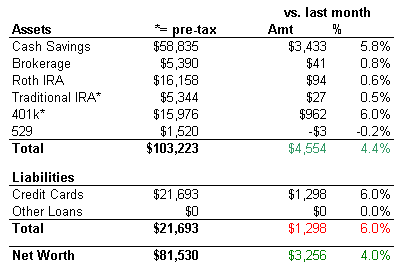 This is our last month of dual incomes, but it was a pretty good month. Major purchases-wise, I had to pay tuition for my summer classes this month. Overall, our net worth increased $3,256 from last month to $81,530. Our non-retirement funds now total $44,052. We won’t be able to keep up our current pace towards our mid-term goal of $100,000 for now, but I still think it’s reachable. We’ve already maxed out both of our Roth IRAs for 2005, and I’ve already put more than $4k into my 401k this year, so I think we’re good for retirement funding for this year. I will definitely be putting more emphasis on controlling monthly costs since I’ll have more time.