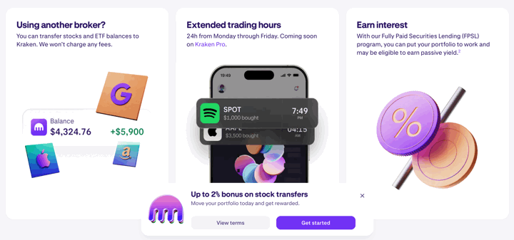A limited-time incentive offering for eligible U.S. users, providing up to a 2% bonus for qualified transfers of stocks/ETFs into Kraken Securities via ACATS. Kraken+ subscribers are eligible for a 2% bonus. Non Kraken+ users will receive a 1% bonus.Who is eligible?