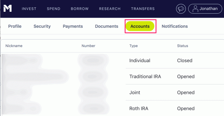 Find both your Traditional and Roth IRA account numbers. It’s conversion time. To find your account numbers, find your name in the top right corner. Click on that, and then click on “View Account Settings”. Then click on the subheading “Accounts”. You should end up with a list of your account nicknames, account numbers, and account types.