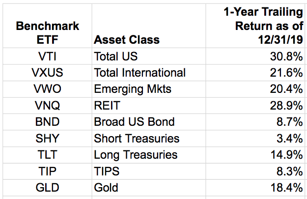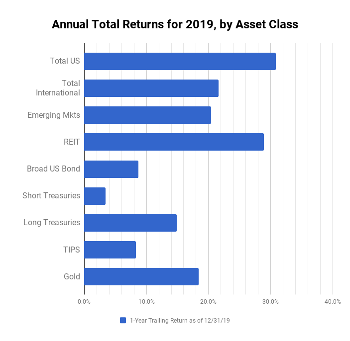 I used to add up my net worth every month (if not more frequently), but nowadays I limit myself to quarterly portfolio checks to coincide roughly with when my dividends arrive. There is so much daily noise about stock market prices these days that I’ve found it much more relaxing this way. However, I do enjoy a brief reflection at the end of the year. Here are the annual returns for select asset classes as benchmarked by ETFs per Morningstar after market close 12/31/19.