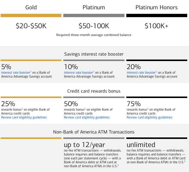 • From what I understand, you have to have an average daily balance of the required amount over a three month period to qualify for the reward tier. It isn’t a crossing the threshold once thing to get it. Once you’re in, Bank of America reviews the account once a year to see if you can renew. They give you a warning that you need to get your balance up to x or risk losing the reward status before they pull it the following year. Technically, once you’re in, you can pull your money out and keep your reward tier all year until review, rinse repeat.