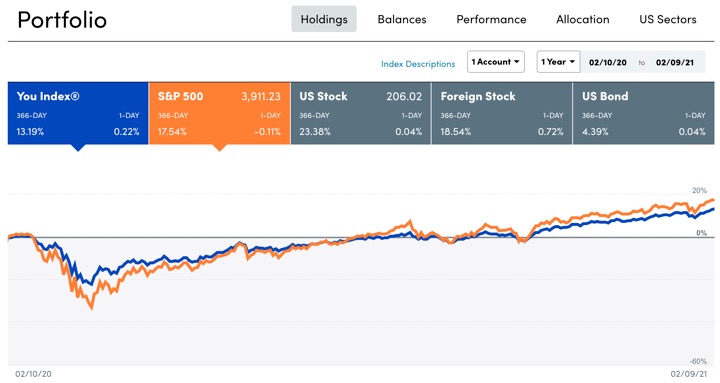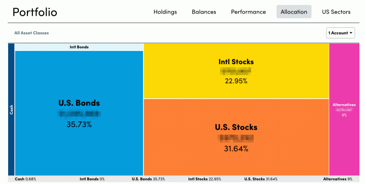 Here are some performance and asset allocation charts, per the “Allocation” and “Holdings” tabs of my Personal Capital account, respectively: