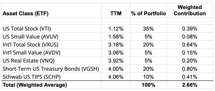 Dividend and interest income yield. To estimate the income from my portfolio, I use the weighted “TTM” or “12-Month Yield” from Morningstar (checked 1/4/26), which is the sum of the trailing 12 months of interest and dividend payments divided by the last month’s ending share price (NAV) plus any capital gains distributed (usually zero for index funds) over the same period. My TTM portfolio yield is now roughly 2.66%.