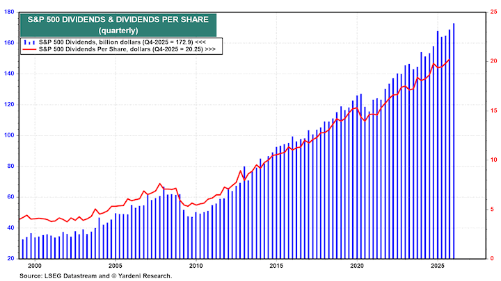 Here is the historical growth of the S&P 500 total dividend, which tracks roughly the largest 500 stocks in the US, updated as of 2025 Q4 (via Yardeni Research):
