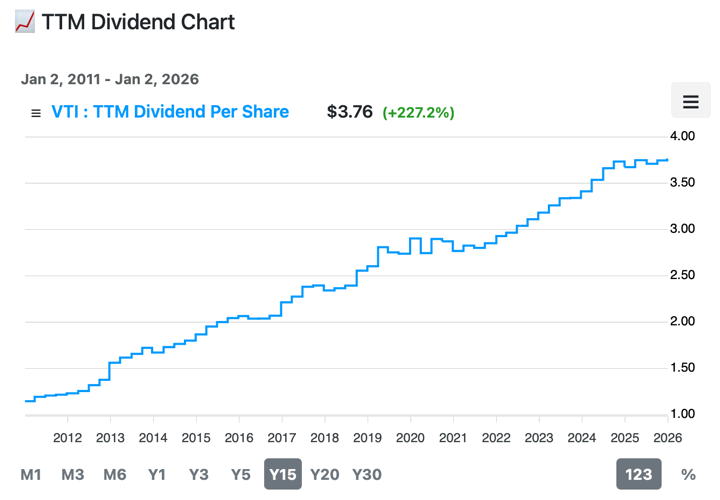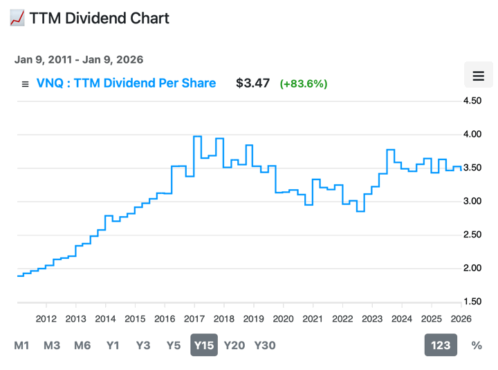 In the case of Real Estate Investment Trusts (REITs), they are legally required to distribute at least 90 percent of their taxable income to shareholders as dividends. Historically, about half of the total return from REITs is from this dividend income. Here is an updated chart of the trailing 12-month (ttm) dividend per share over the last 15 years paid by the Vanguard Real Estate Index ETF (VNQ).