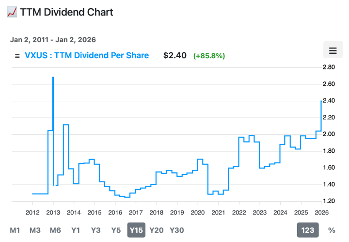 European corporate culture tends to encourage paying out a higher (sometimes even fixed) percentage of earnings as dividends, but that also means the dividends move up and down with earnings. The starting yield is currently higher but may not grow as reliably. Here is an updated chart of the trailing 12-month (ttm) dividend per share over the last 15 years paid by the Vanguard Total International Stock ETF (VXUS).