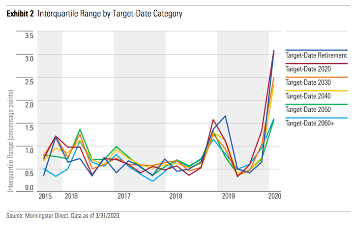 Glide paths stick closer to the average across funds during the early accumulation years, but differ much more as you near retirement. Near-retirees take notice! The chart below shows the historical percentage difference in quarterly return between funds with the same target dates. (All the 2020 funds were compared, all the 2030 funds were compared, etc.) You can see that during the “COVID crash” in Q1 2020, the biggest difference in performance actually came from the funds meant for those in retirement.