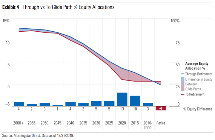 Some TDFs maintain a higher equity allocation and keep lowering it gradually “through” the retirement date, while others decrease more sharply right up “to” the retirement date and then hold things steady. For a 2020 fund, this could mean a 15% difference in the amount of stocks being held in 2020 (ex. 45% stocks vs. 30% stocks). The situation actually flips a decade after retirement and the “through” funds end up holding less stocks on average.
