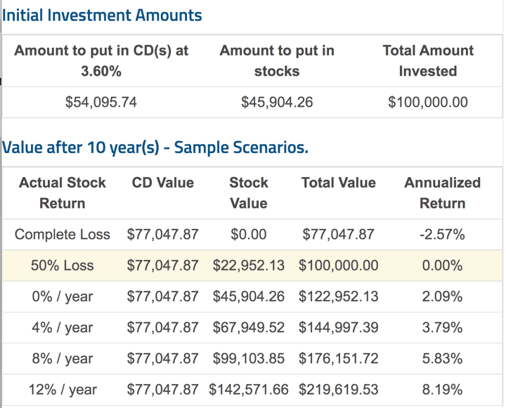 What if you had a little more faith and just wanted a money back guarantee against the possibility of a 50% stock market loss after 10 years? That would allow you even more stock market exposure at roughly 45% stocks and 55% bank CDs: