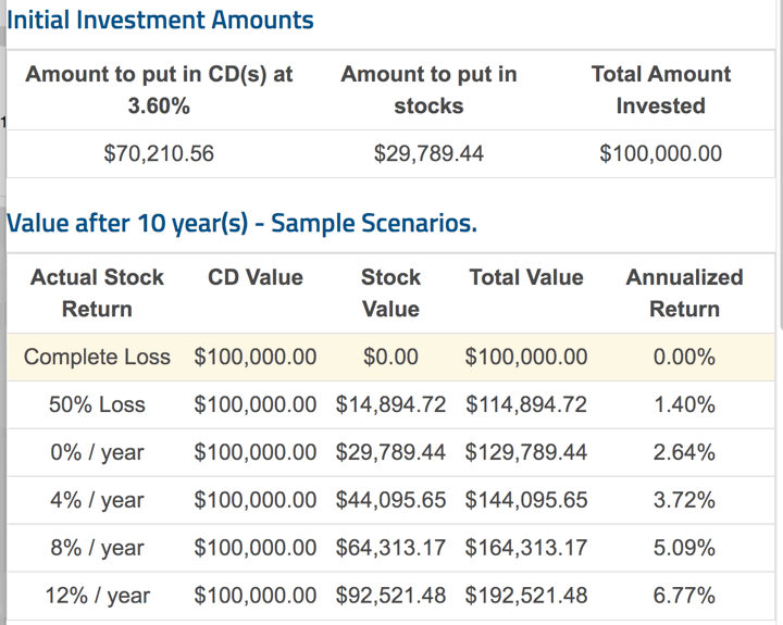 Let’s say you have $100,000. Right now, I see a 10-year FDIC-insured CD paying 3.60% APY (non-callable!) available from Vanguard. Using the Zero Risk Investment calculator from DepositAccounts, I know that I could put $70,210.56 into that CD today, and at the end of 10 years, I will be able to withdraw $100,000 no matter what. That means, I can take the remaining $29,789.44 today and buy stocks. Even if those stocks implode and lose every single penny of value, I will still have $100,000 at the end of 10 years. 100% Money Back Guarantee!
