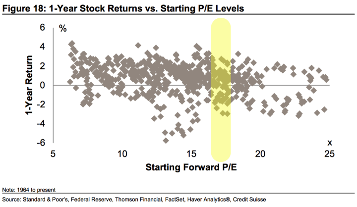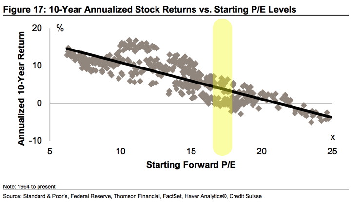 Here are some charts from a Credit Suisse research report that you should keep in mind when reading articles about high valuations and future returns. I first saw the highlighting done by WSJ Daily Shot, but I can’t find the post anymore.