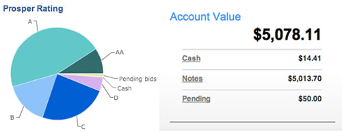 Prosper.com account value: $5,078.11 (includes principal + accrued interest, after fees)