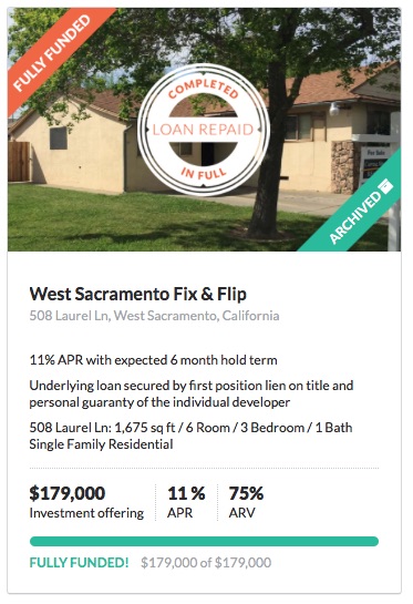 My first investment into real estate crowdfunding has completed. In April 2015, I invested $5,000 into a fix-and-flip loan at the site Patch of Land. There are more details in my initial update, but here’s a quick recap of the loan details: