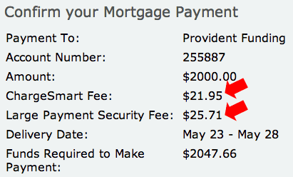 Step 2 is your address information, and Step 3 is your credit card information. So far so good. But in Step 4, they tacked on a “large payment security fee” which added another $25.71 to make the total fee amount $47.66, working out to 2.4% of $2,000. Trying out some different lenders, the final fee amount seems to always work out to about 2.4% for payments over $1,000 or so.
