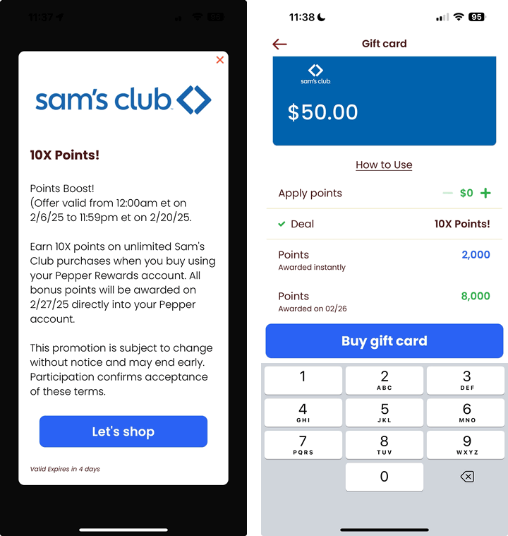 Update 3/14: New extended sales from now until 11:59p ET on March 16th. Be sure you see the offer on your screen before tapping “Buy gift card”. For example, if you buy a $50 Sam’s Club gift card during an 10X offer you’ll get a total of 10,000 points – 2,000 instantly and 8,000 extra later (10,000 points = $5, example screenshot below). I check the Pepper app first thing every morning to see the limited-time Flash Sales and to redeem all my available points that arrived from past purchases. Also, check your AmEx Offers to see if you have a targeted $30 off $75 at Pepper.