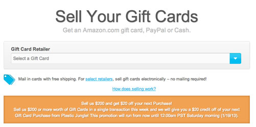 Sell us $200 or more worth of Gift Cards in a single transaction this week and we will give you a $20 credit off of your next Gift Card Purchase from Plastic Jungle! This promotion will run from now until 12:00am PST Saturday morning (1/19/13).